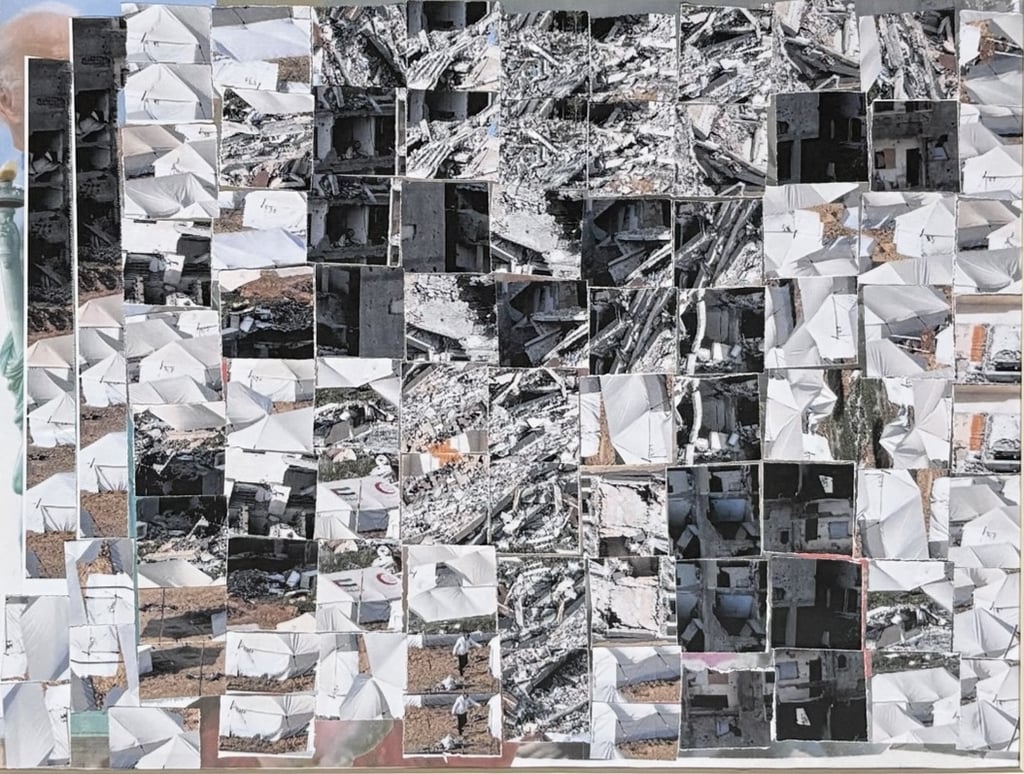 In 2024 90% of the Gazan population of 2.1 million people were displaced from their homes. Many were displaced more than once. According to the Costs of War Project at Brown University the US spent $17.9 billion on military aid to Israel in the year from October 2023.That’s why the Statue of Liberty and Joe Biden are cowering in the corner of the picture under the tents and rubble.