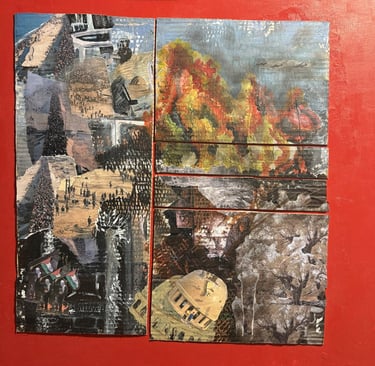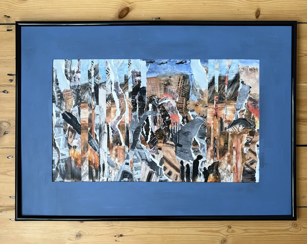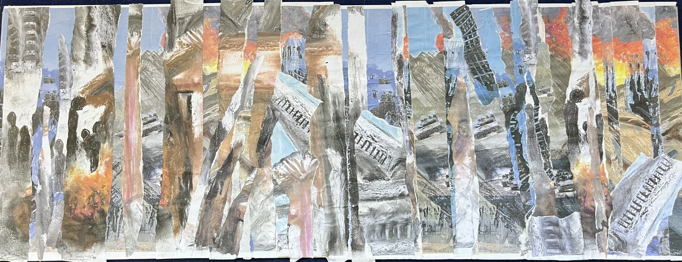I made this on card which I then cut to reflect destruction. I was responding to the devastation and including small Images of fight back.