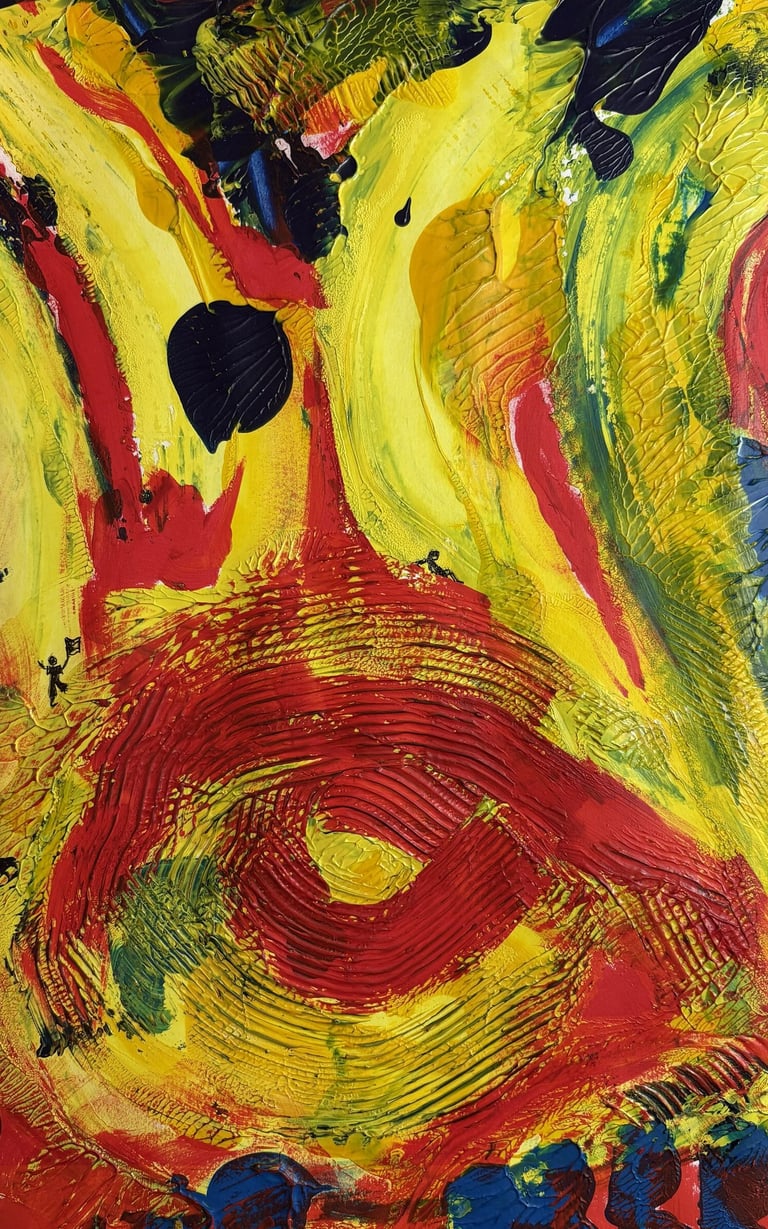 I have started working on the Resilience series in the hope of reflecting, at least to some small extent, the resilience of the Palestinian people. One way I’m trying to do this is by painting tiny images of people staying strong in the midst of the vast forces enveloping them . Another way is simply by the strength of the colours and the interaction of the shapes in the pictures.